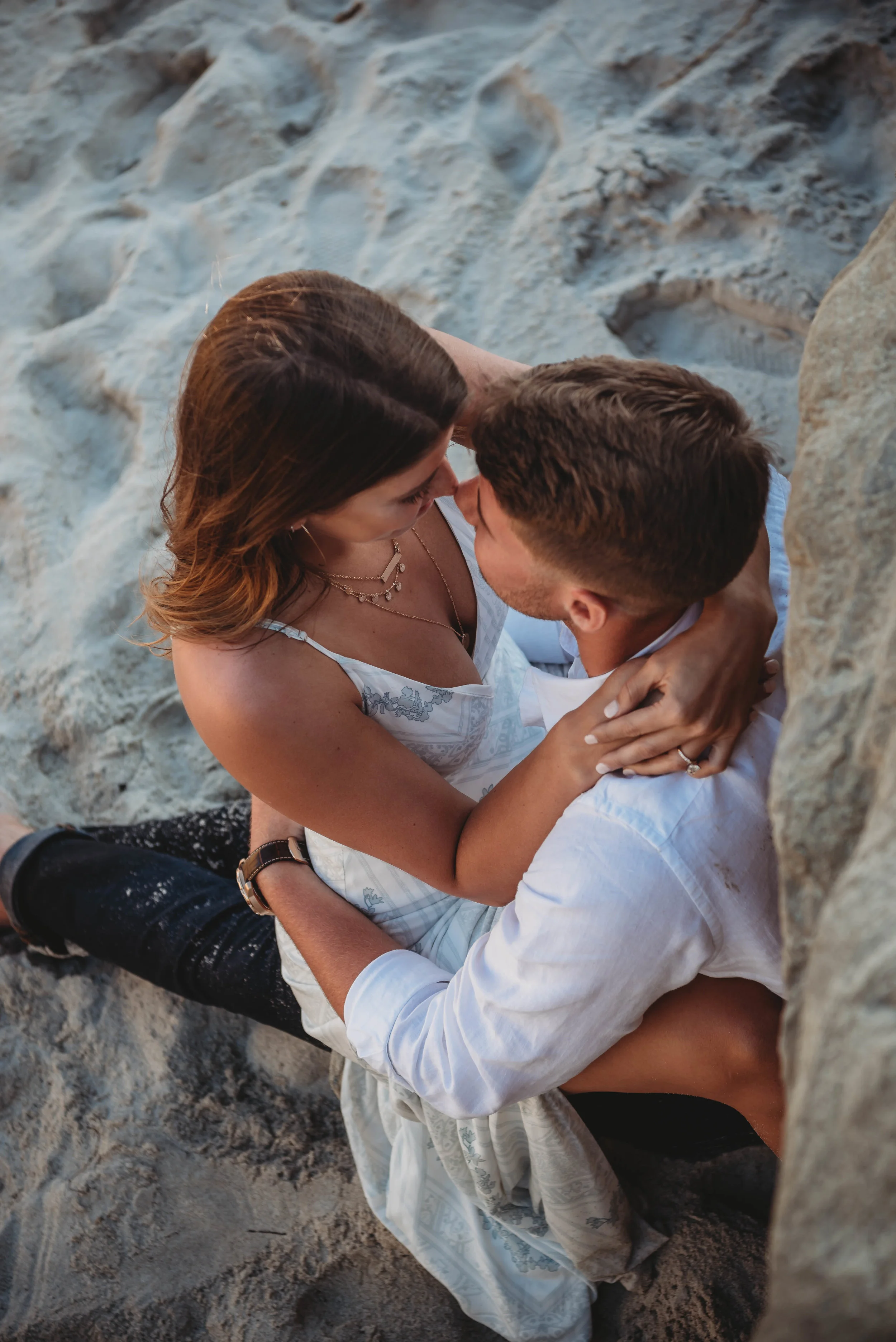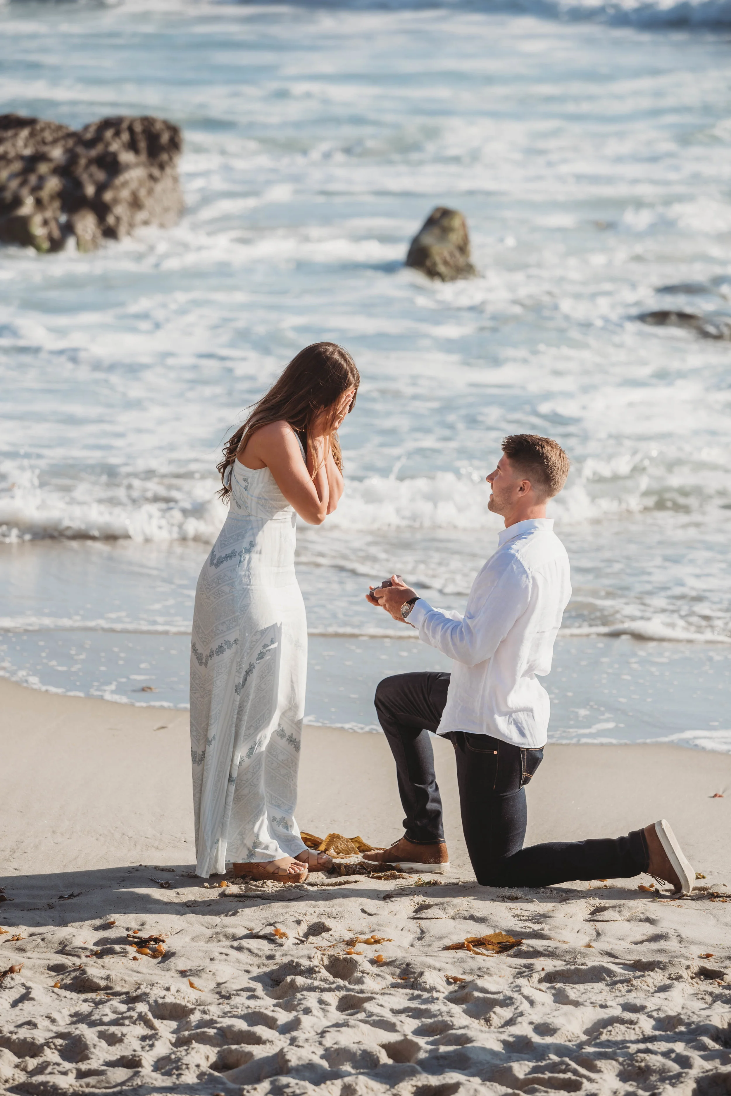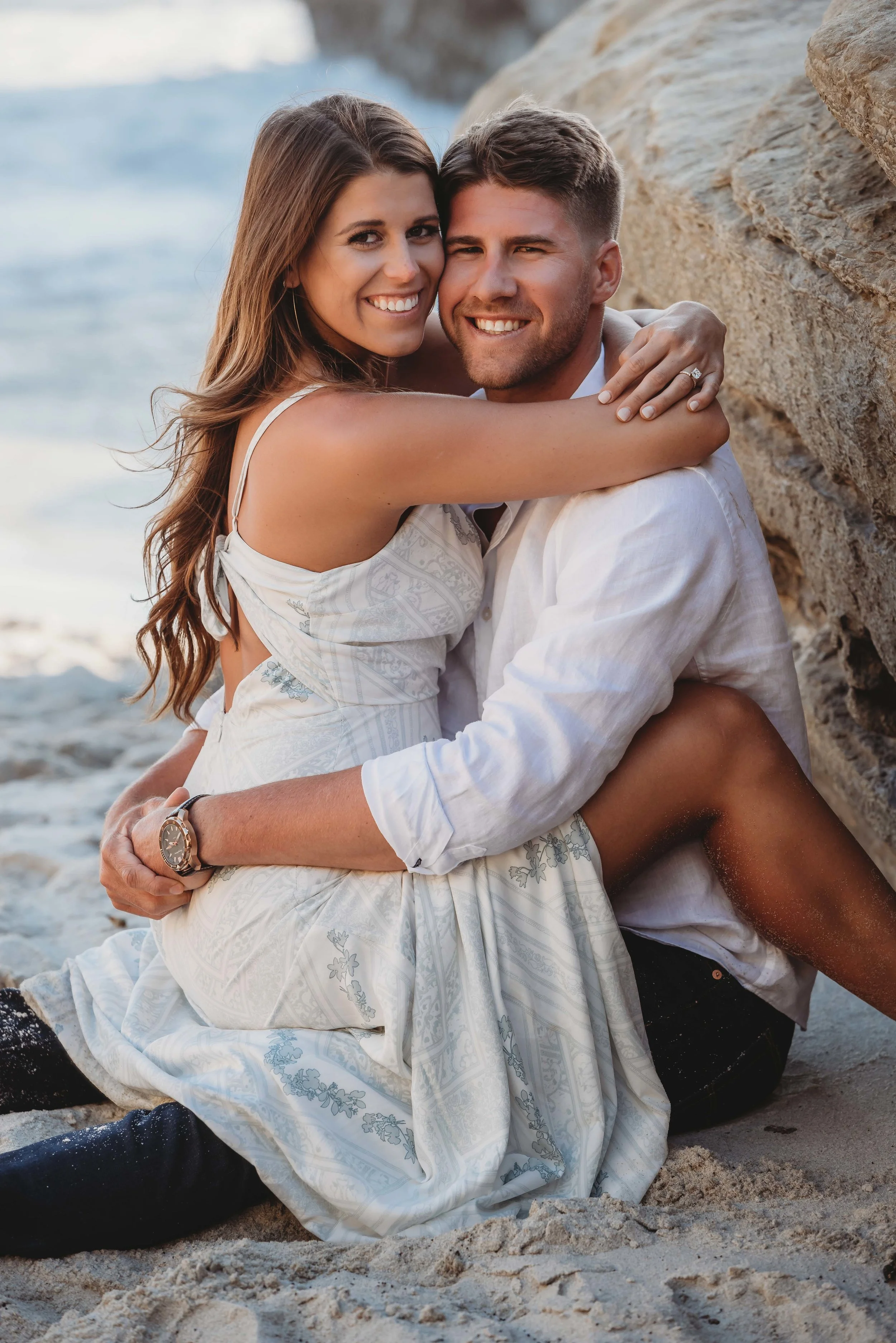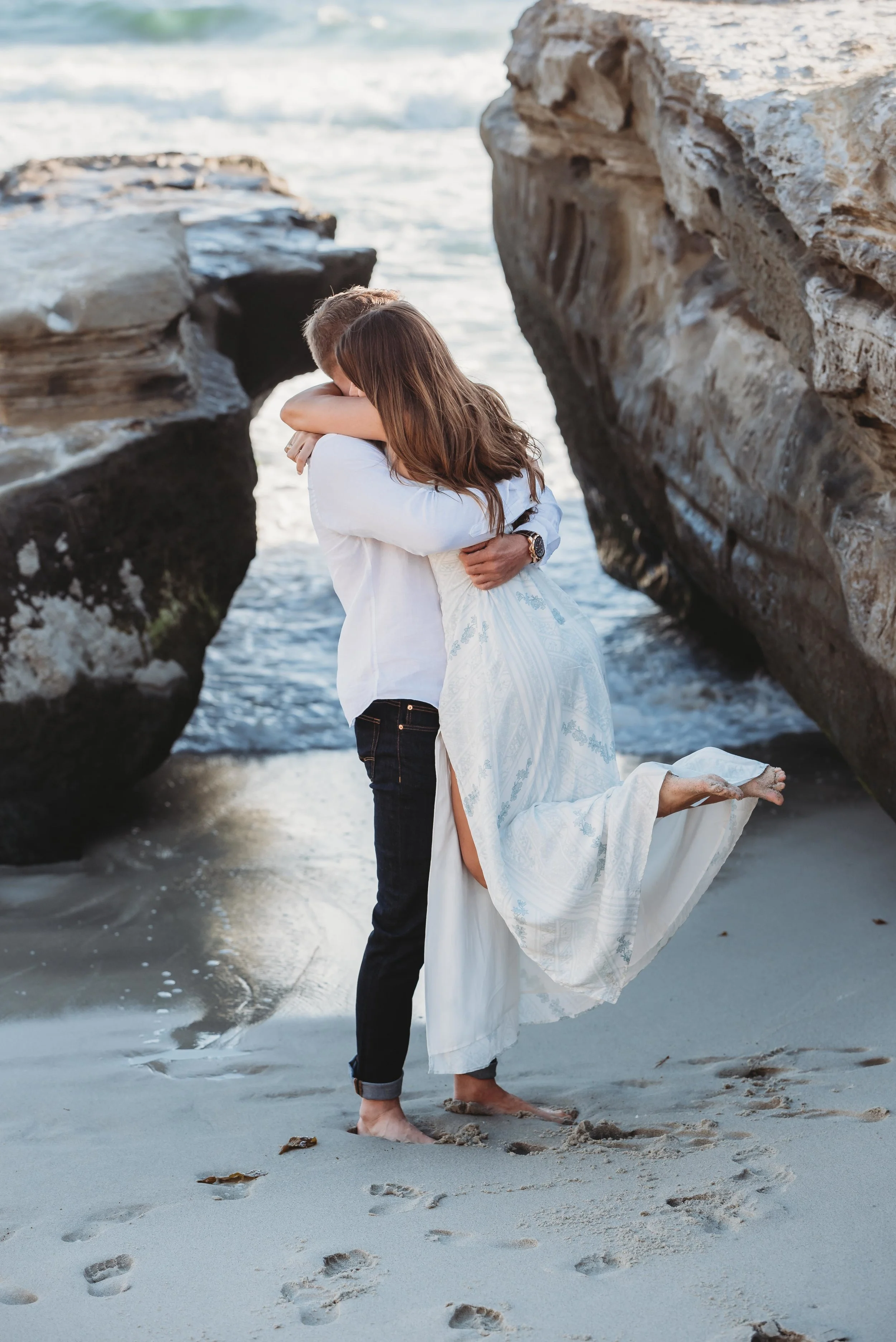 Brandon surprised Casey with a trip to San Diego and told her they were going to a nice restaurant on the beach.. He told her the only way to it was to walk on the beach (not ideal in wedges). They walked in Windansea Beach in La Jolla until he found his perfect spot and had already planned hidden photographers (myself and Olia Luis) and got down on one knee to tell Casey that she has always been the one 13 years later. His proposal was a complete fairytale. Timing is everything!