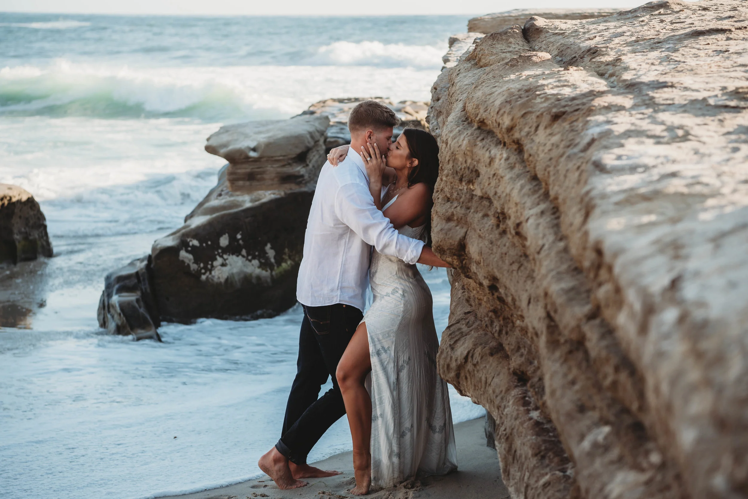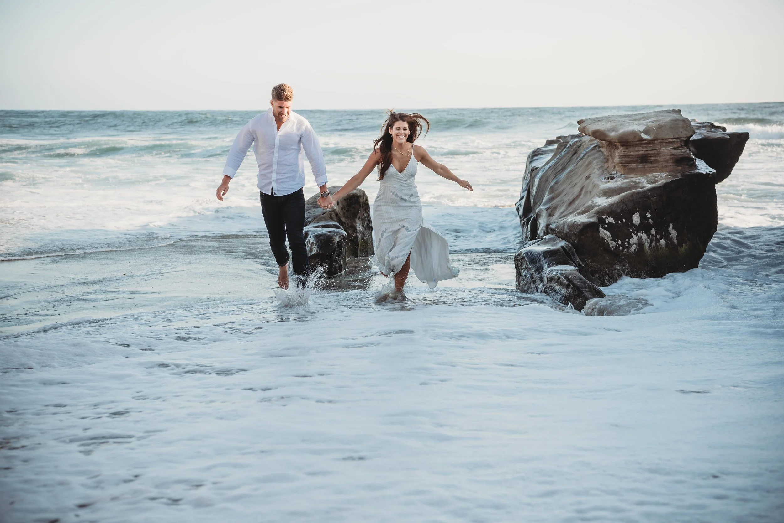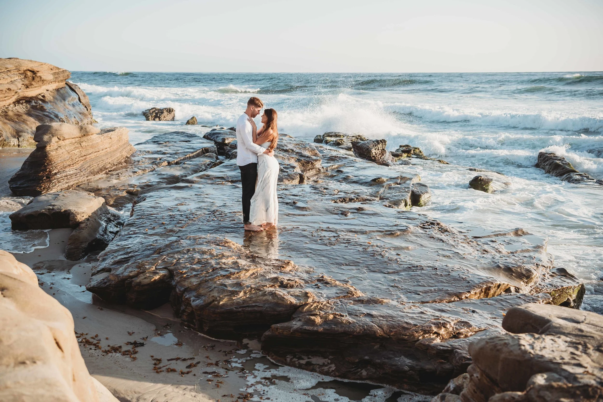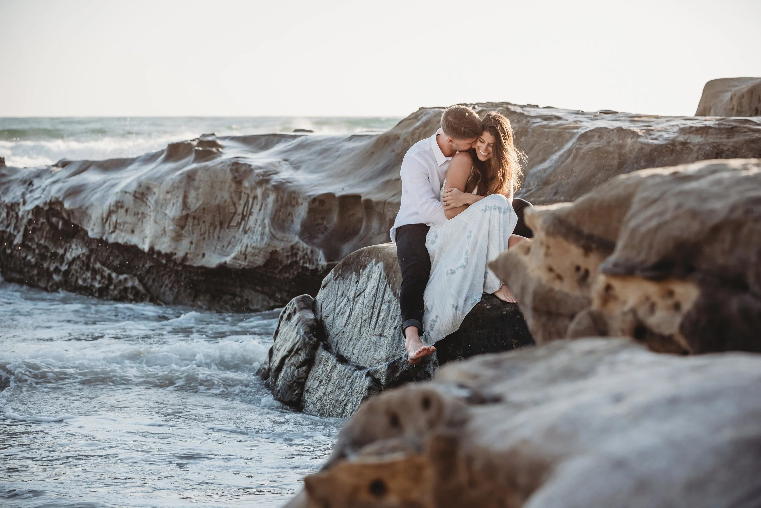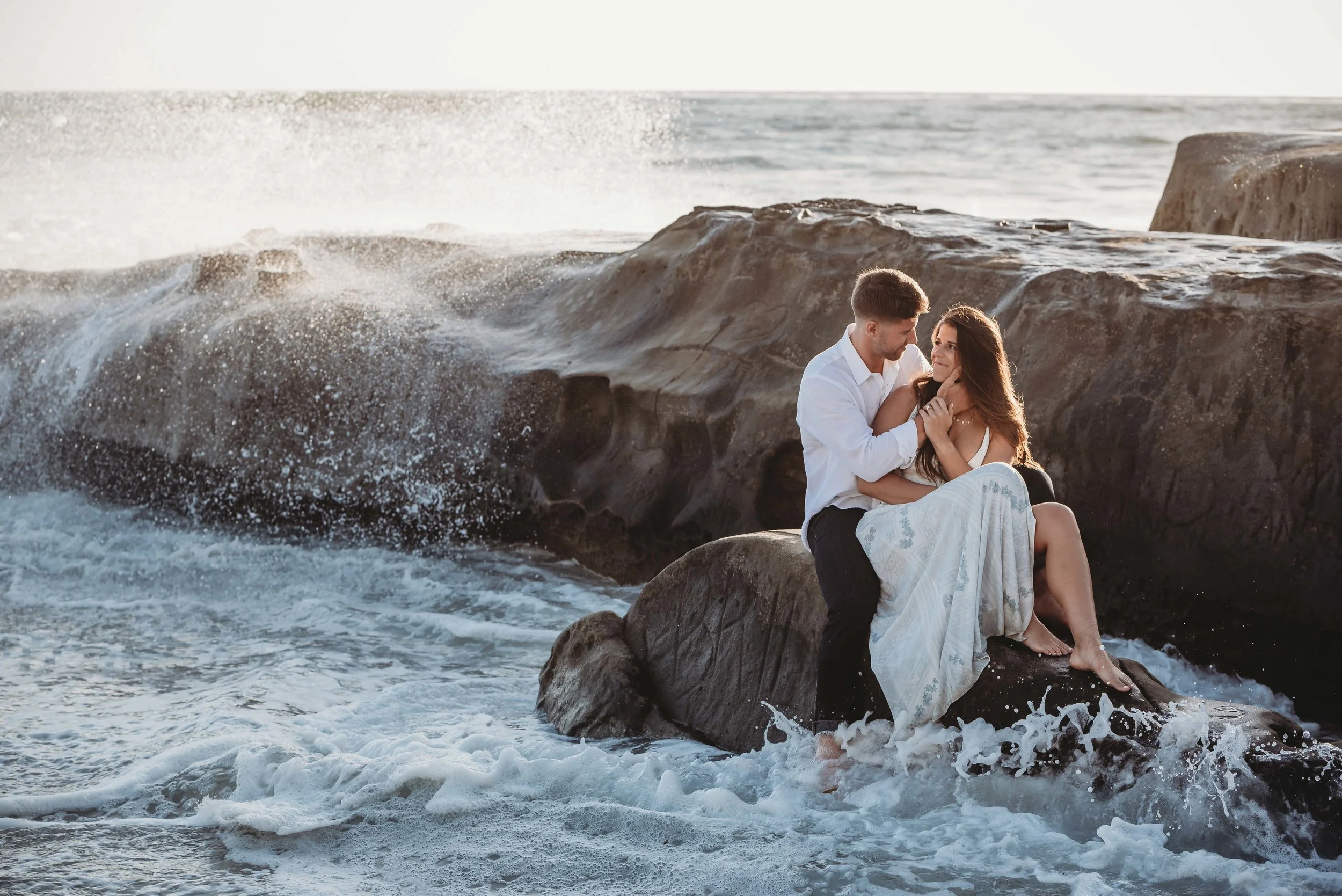 Brandon surprised Casey with a trip to San Diego and told her they were going to a nice restaurant on the beach.. He told her the only way to it was to walk on the beach (not ideal in wedges). They walked in Windansea Beach in La Jolla until he found his perfect spot and had already planned hidden photographers (myself and Olia Luis) and got down on one knee to tell Casey that she has always been the one 13 years later. His proposal was a complete fairytale. Timing is everything!